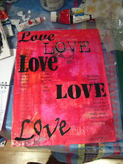 Cathy Nichols is hosting Found Art Fridays, where you can submit work for the last Friday of every month, with each month having a particular theme. The first one is this Friday, and as it’s about to be Feb, the theme is Big Love. Here’s my entry; a mixed media collage with lots and lots of love on it!