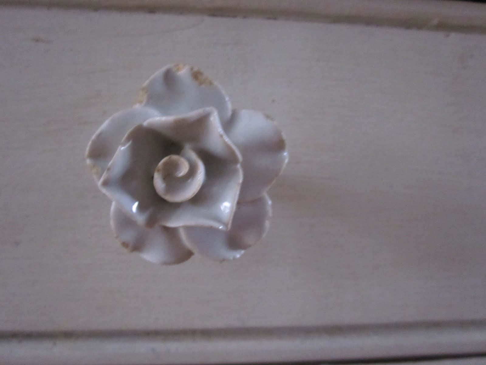 I also replaced the knobs with these pretty ceramic flowers that J the-ex-who-is-still-around gave me from his days working in Pakistan for an antique dealer. There were only three so the cupboard doors may have to have different knobs.