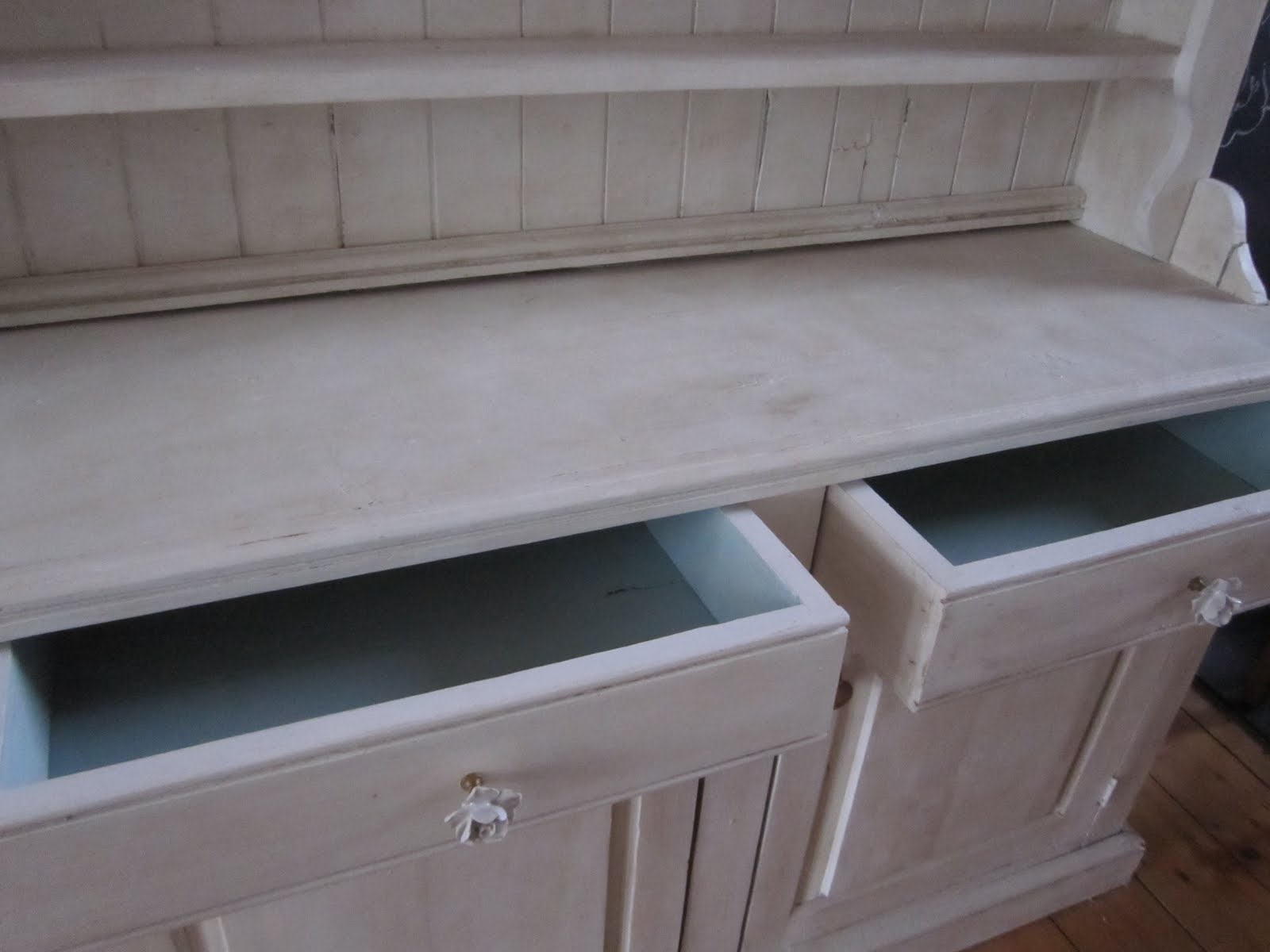 I painted the inside of the drawers and cupboards in a light blue using a tester pot from Farrow and Ball that was lying around.