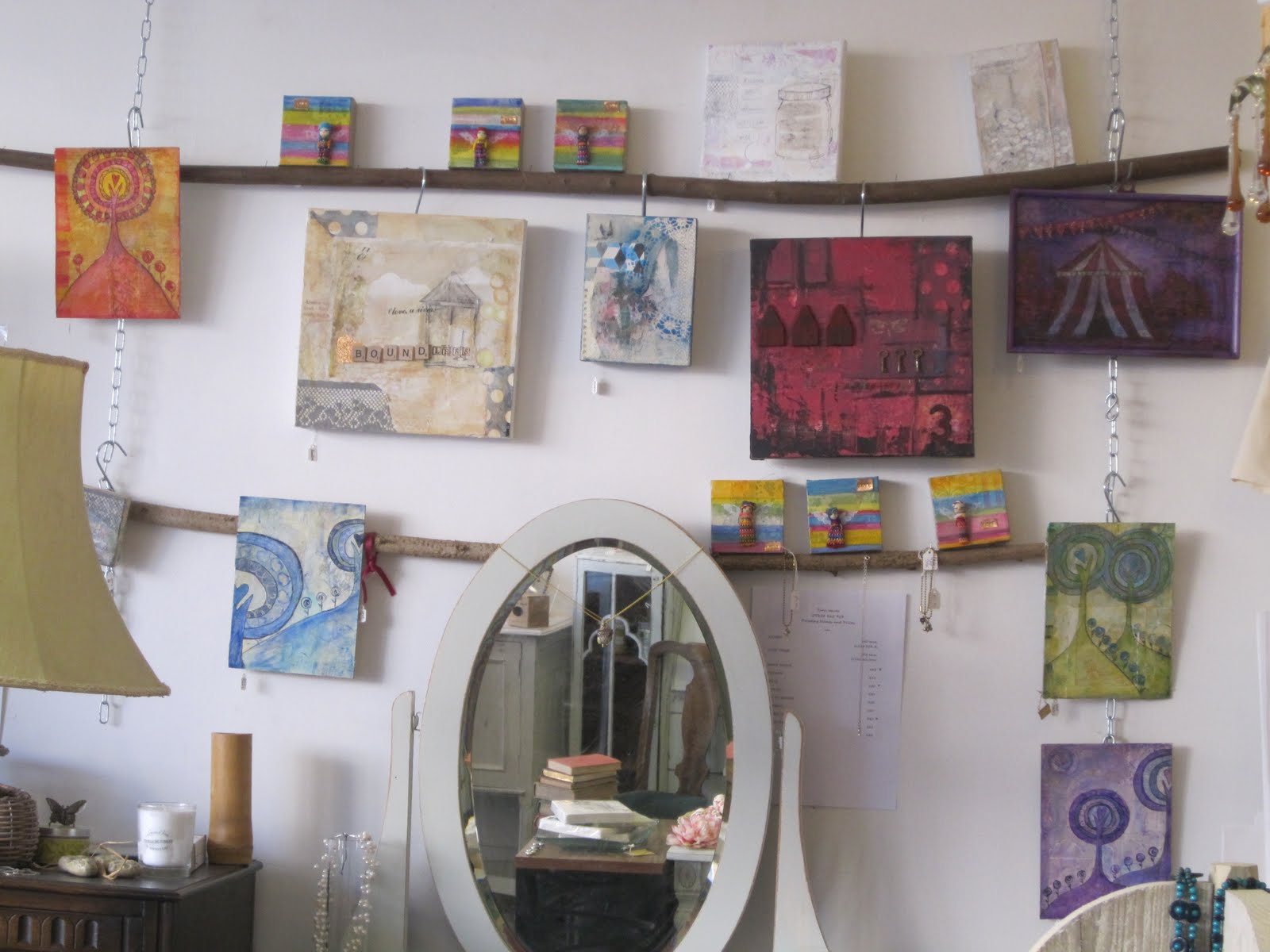 Lulu and Hitch sells lovely painted furniture, vintage finds, cards, gifts, all kinds of nice things. I’ve got my eye on a few bits myself (might have to sell a few more paintings first). I do like the stick arrangement; they used to have necklaces hanging off the hooks which I always thought was a clever display and something you could make yourself.